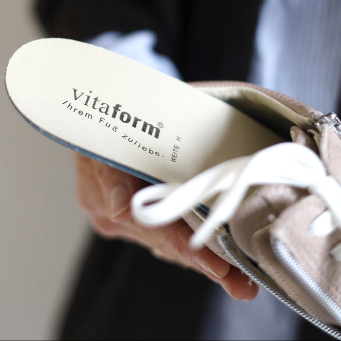 Unsere bequemen VITAFORM Fußbetten lassen sich einfach herausnehmen. Wir bieten zudem eine Vielzahl an alternativen Fußbetten für Sie an. Sie können natürlich auch Ihre eigenen orthopädischen Einlagen in Ihren neuen VITAFORM Schuh verwenden, falls Sie dies wünschen sollten.