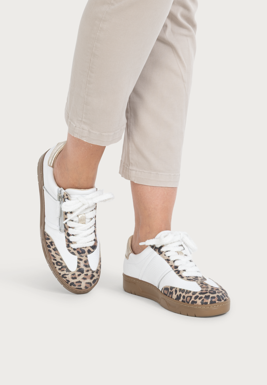 Dieser stilvolle VITAFORM Sneaker begleitet Sie souverän durch Ihren Tag – ob beim Einkauf, im Büro oder Stadtbummel. Gefertigt aus besonders weichem Hirschleder schmiegt sich der Schuh sanft an den Fuß und bietet luxuriöses Tragegefühl. Die modische Leo-Musterung aus feinem Veloursleder an der Fußspitze setzt ein Statement, während die goldfarbene Ferse stilvollen Akzent verleiht. Innen sorgt ein chromfreies, herausnehmbares Komfortfußbett mit integrierter Luftpolsterung für traumhaften Komfort. Zusätzlich schont der VITAFORM Shock-Absorber Ihre Gelenke. Ideal, wenn Sie viel auf den Beinen sind. Dank seitlichem Reißverschluss ist der Sneaker schnell an- und ausgezogen, ohne auf perfekten Sitz zu verzichten und bietet zudem verstellbare Passform, falls Ihre Füße mehr Raum brauchen! Ein besonderes Highlight: die flauschigen Teddy-Schnürsenkel, die dem sportlich-eleganten Look kuschelige Note verleihen. Ein Sneaker für Frauen, die keine Kompromisse eingehen – beim Stil und Komfort.