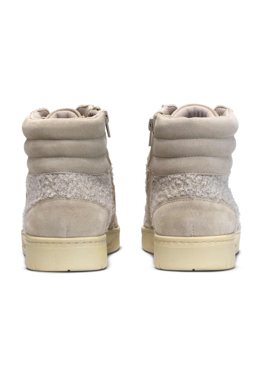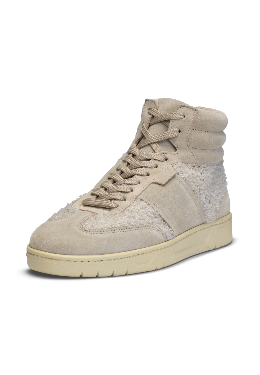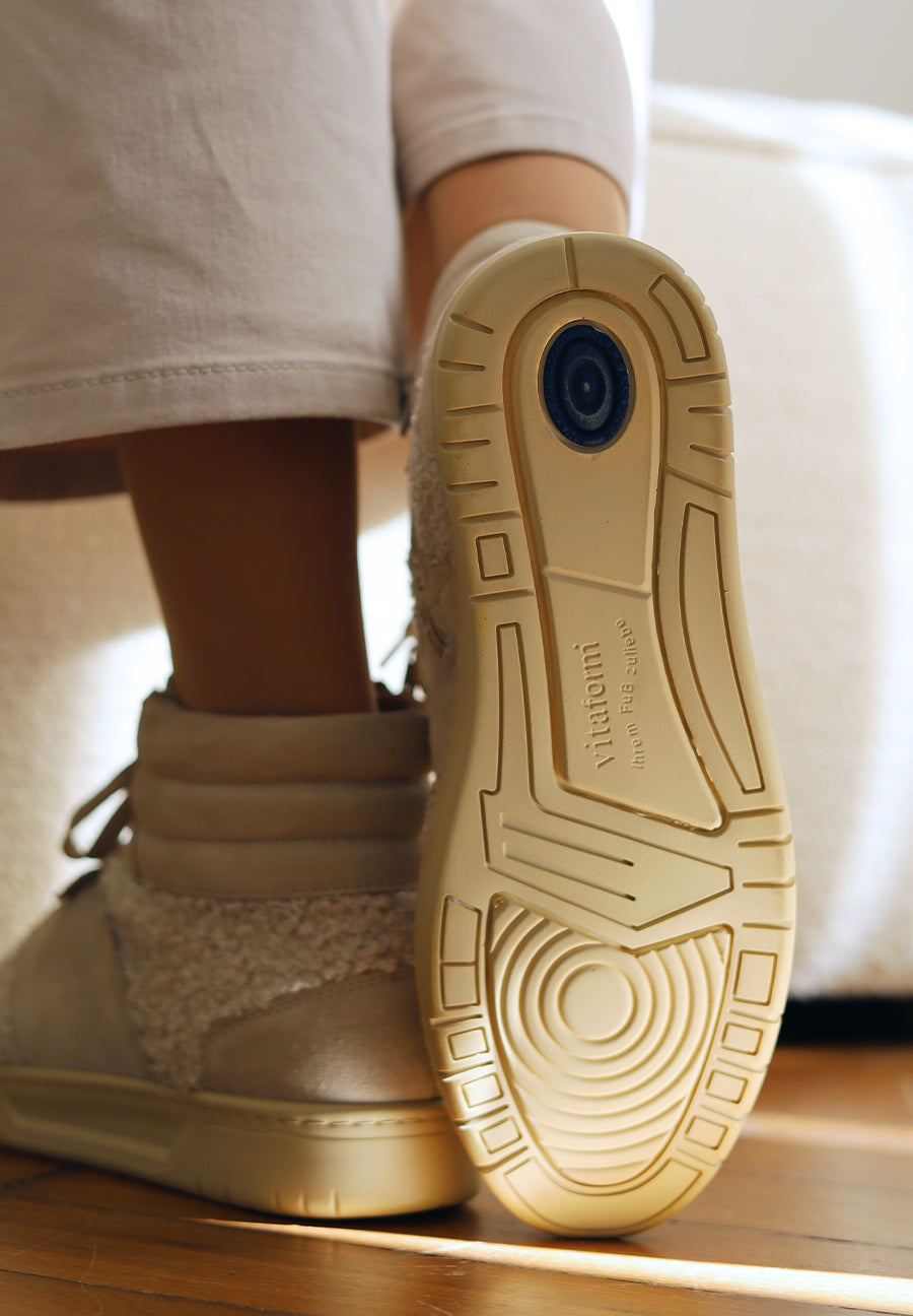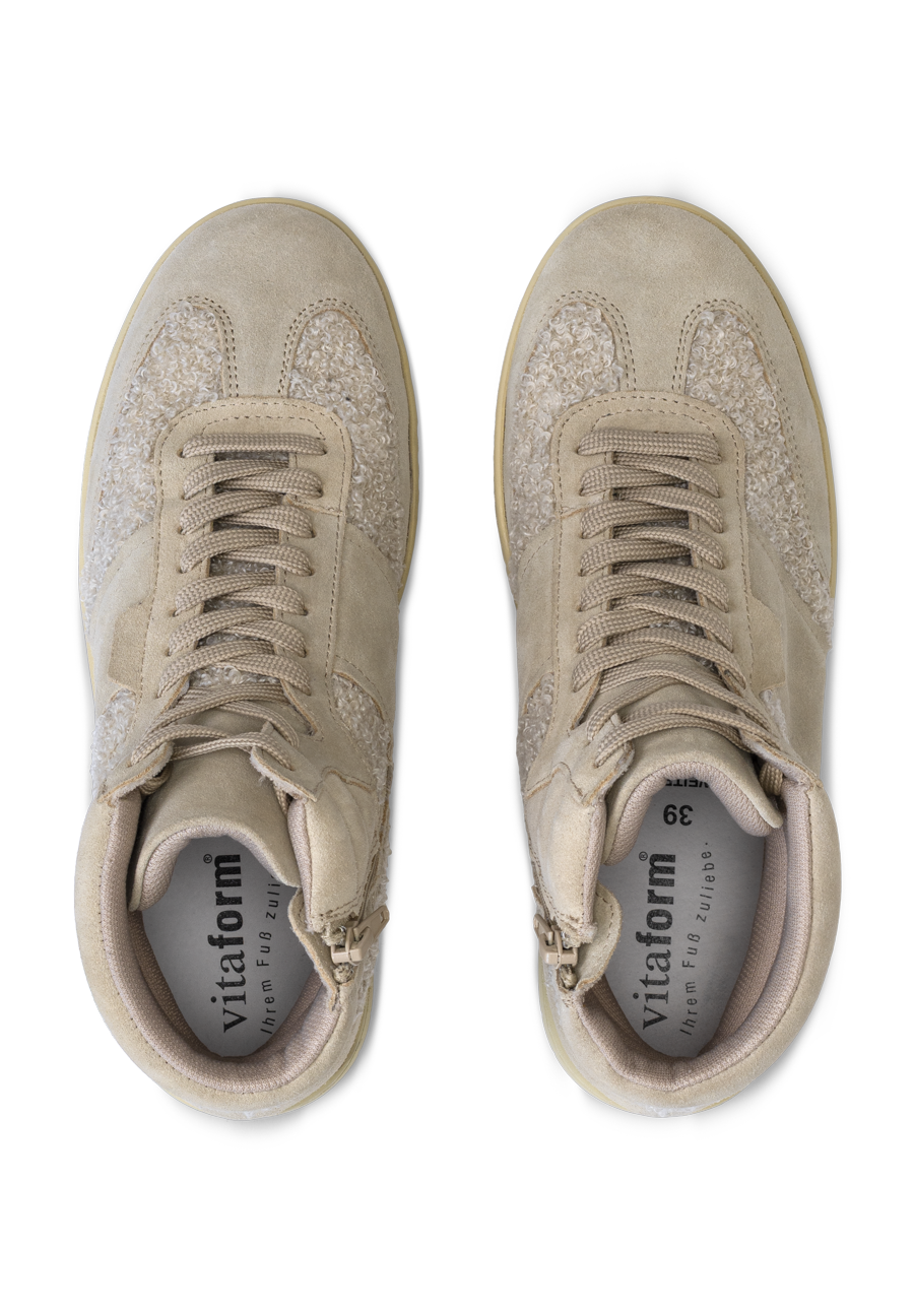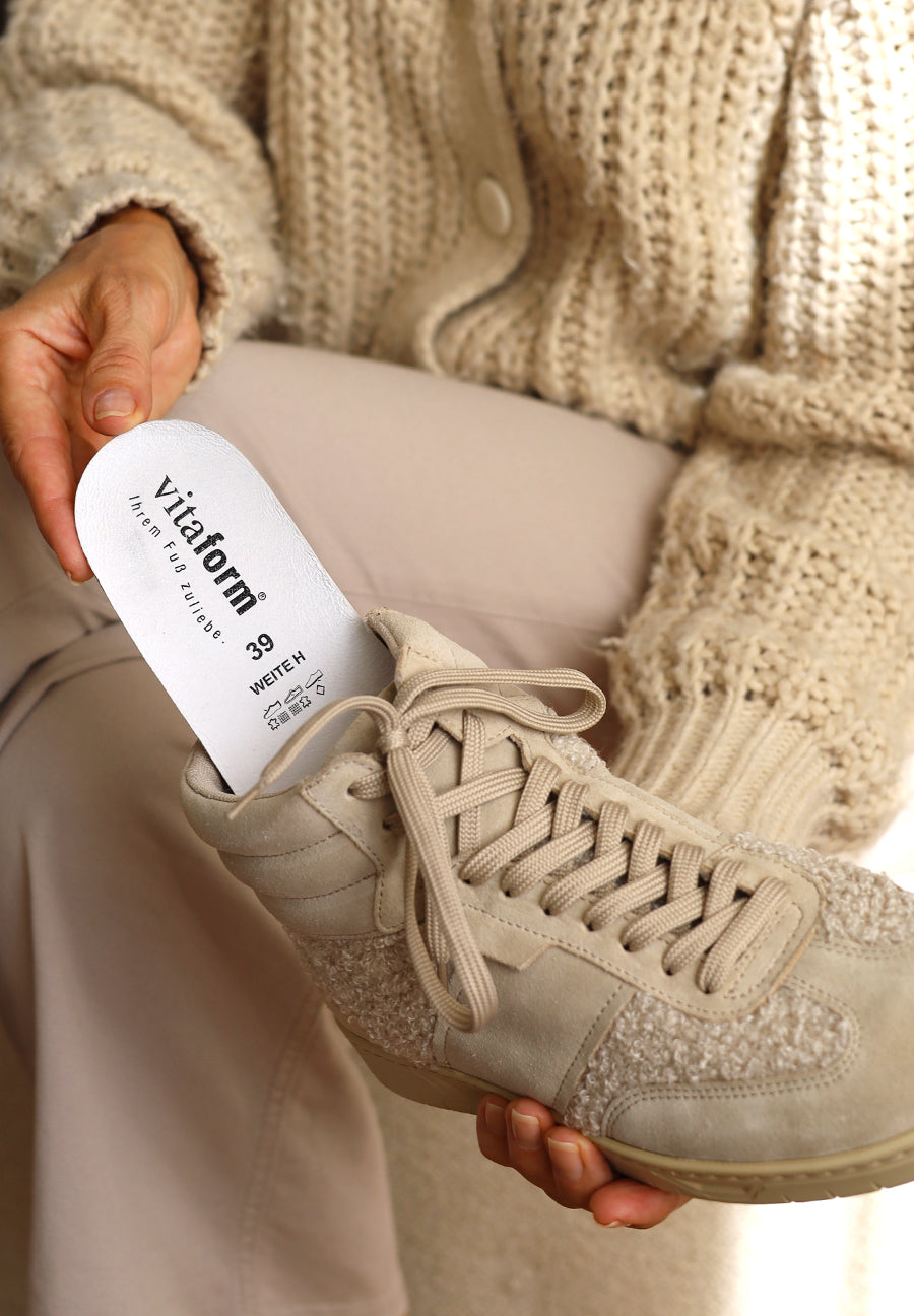 Dieser flauschig coole VITAFORM High-Top Sneaker bringt frischen Schwung in Ihre Herbstgarderobe – mit einem außergewöhnlichen Materialmix aus Leder und flauschigem Teddyplüsch, der nicht nur optisch begeistert, sondern auch herrlich weich am Fuß liegt. Das strukturierte Obermaterial verleiht dem Schuh eine moderne, urbane Ausstrahlung mit modischem kuscheligem Twist. Innen sorgt ein extra gepolstertes, herausnehmbares Komfortfußbett mit chromfreiem Echtlederbezug für ein angenehm sanftes Laufgefühl. Der integrierte Shock-Absorber federt jeden Schritt effektiv ab und schont so Rücken, Knie und Gelenke. Die bequeme Komfortweite H schenkt dem Fuß ausreichend Raum, während der seitliche Reißverschluss ein schnelles Hineinschlüpfen ermöglicht – ideal für den Alltag in der Stadt. Ein trendiger Sneaker für Frauen, die Wert auf Komfort legen, dabei aber nicht auf einen coolen Look verzichten wollen.