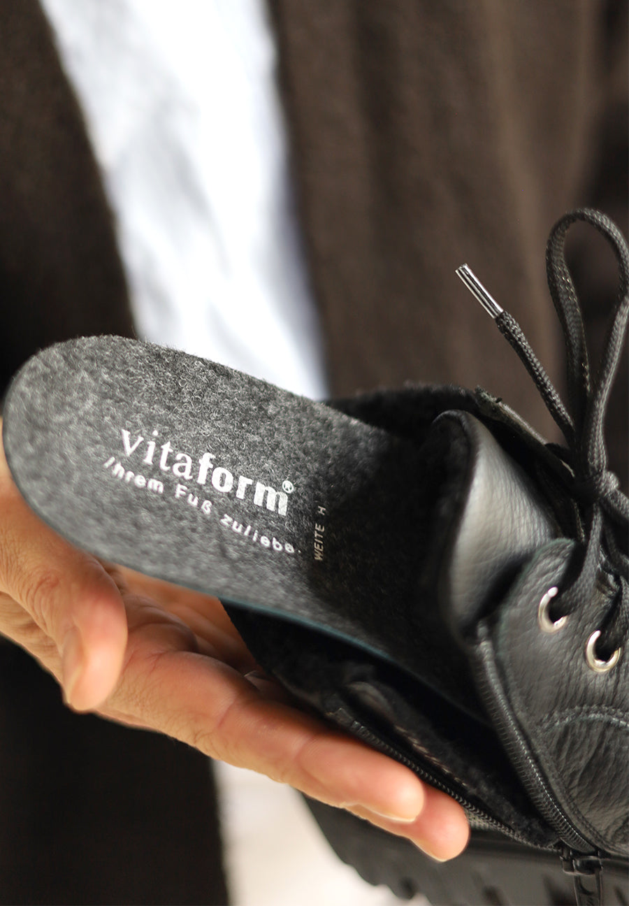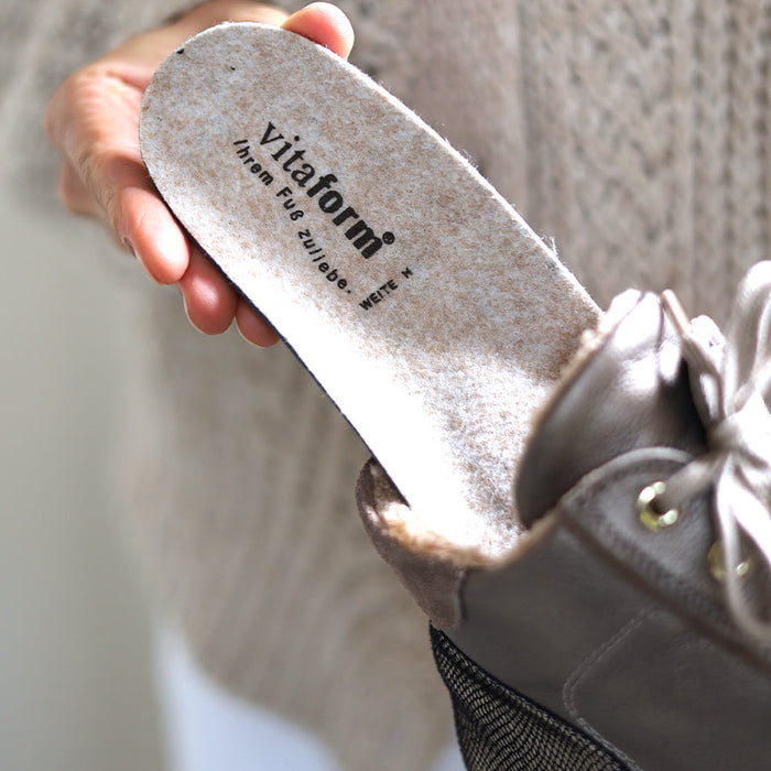 Unsere bequemen VITAFORM Fußbetten lassen sich einfach herausnehmen. Wir bieten zudem eine Vielzahl an alternativen Fußbetten für Sie an. Sie können natürlich auch Ihre eigenen orthopädischen Einlagen in Ihren neuen VITAFORM Schuh verwenden, falls Sie dies wünschen sollten.