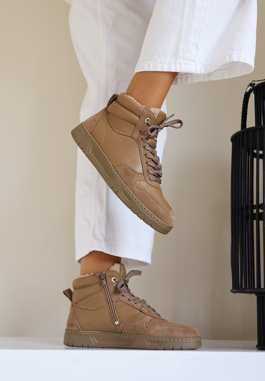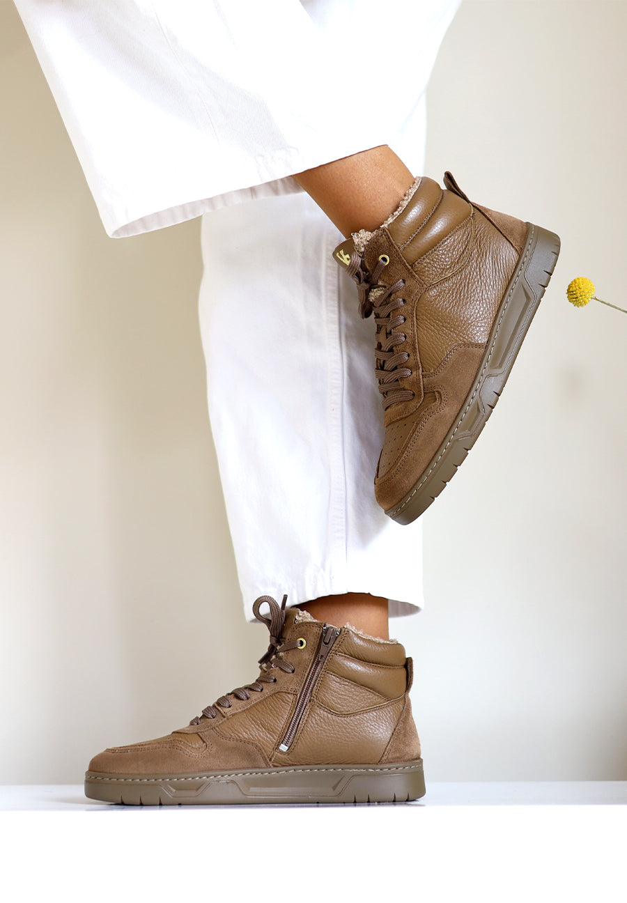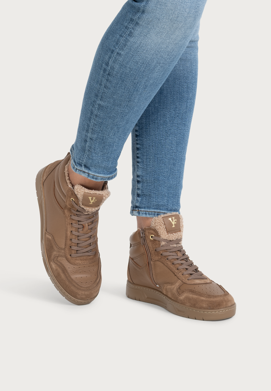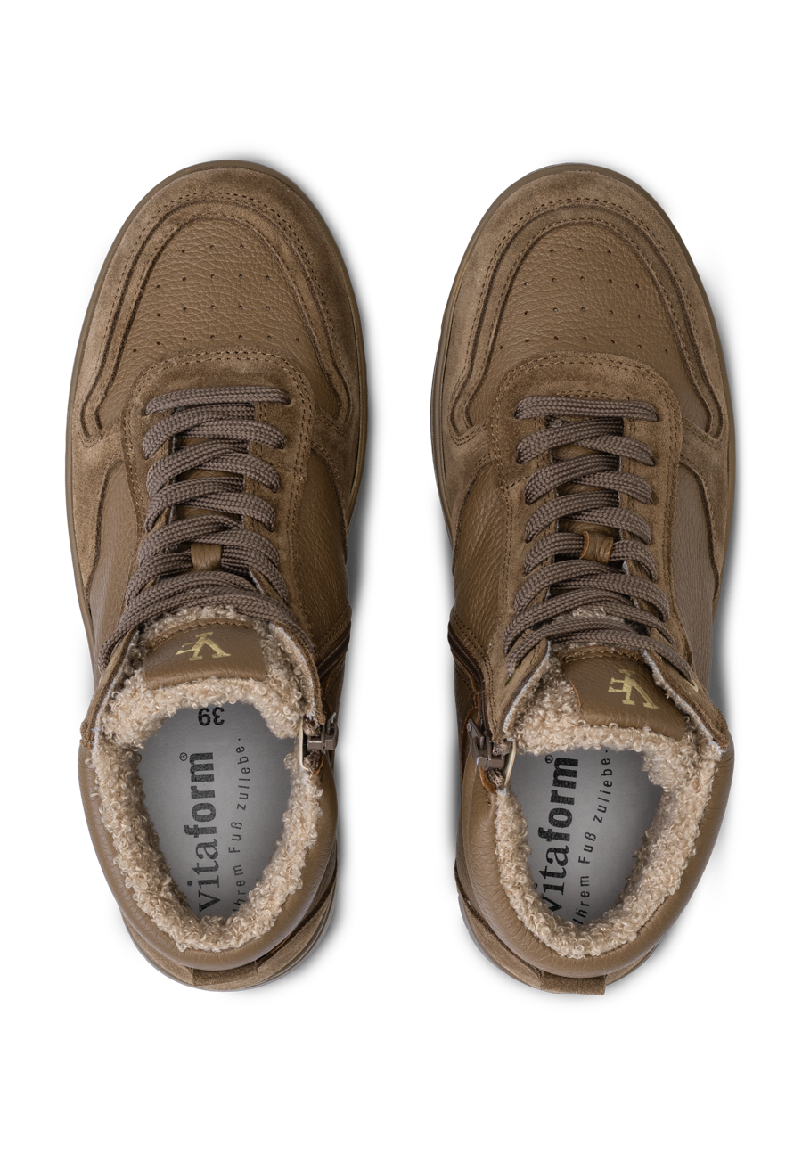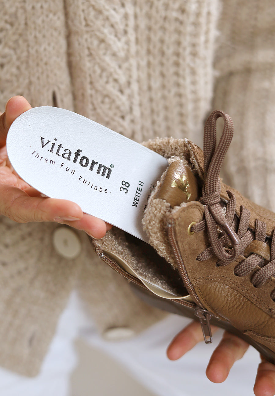 Dieser stylische VITAFORM High-Top Sneaker aus geschmeidigem Hirschleder verbindet urbanen Stil mit herausragendem Komfort – perfekt für modebewusste Frauen, die auch an kühlen Tagen nicht auf ein stylisches Auftreten verzichten wollen. Das besonders weiche, italienische Hirschleder schmiegt sich angenehm an den Fuß, während die kuschelige Teddyplüsch-Fütterung innen wohlige Wärme spendet. Dank der Komfortweite H und dem seitlichen Reißverschluss bietet der Schuh nicht nur ausreichend Platz, sondern lässt sich auch mühelos an- und ausziehen. Das austauschbare Komfortfußbett mit Luftpolsterung sorgt gemeinsam mit dem integrierten Shock-Absorber für eine spürbare Entlastung bei jedem Schritt – ideal für aktive Tage in der Stadt. Ein Sneaker, der sportliche Eleganz mit funktionalem Wohlgefühl kombiniert und Sie stilvoll durch den Herbst begleitet.