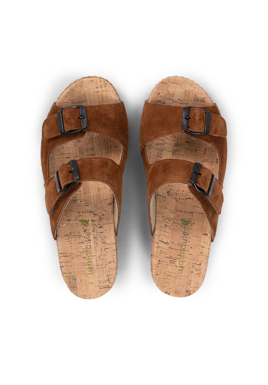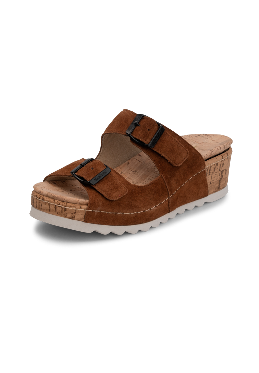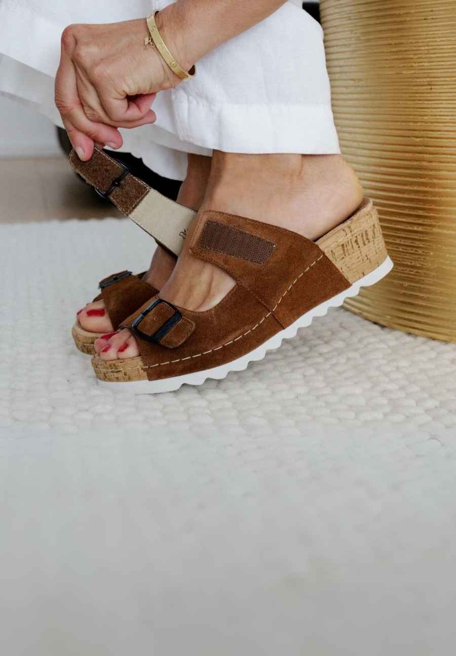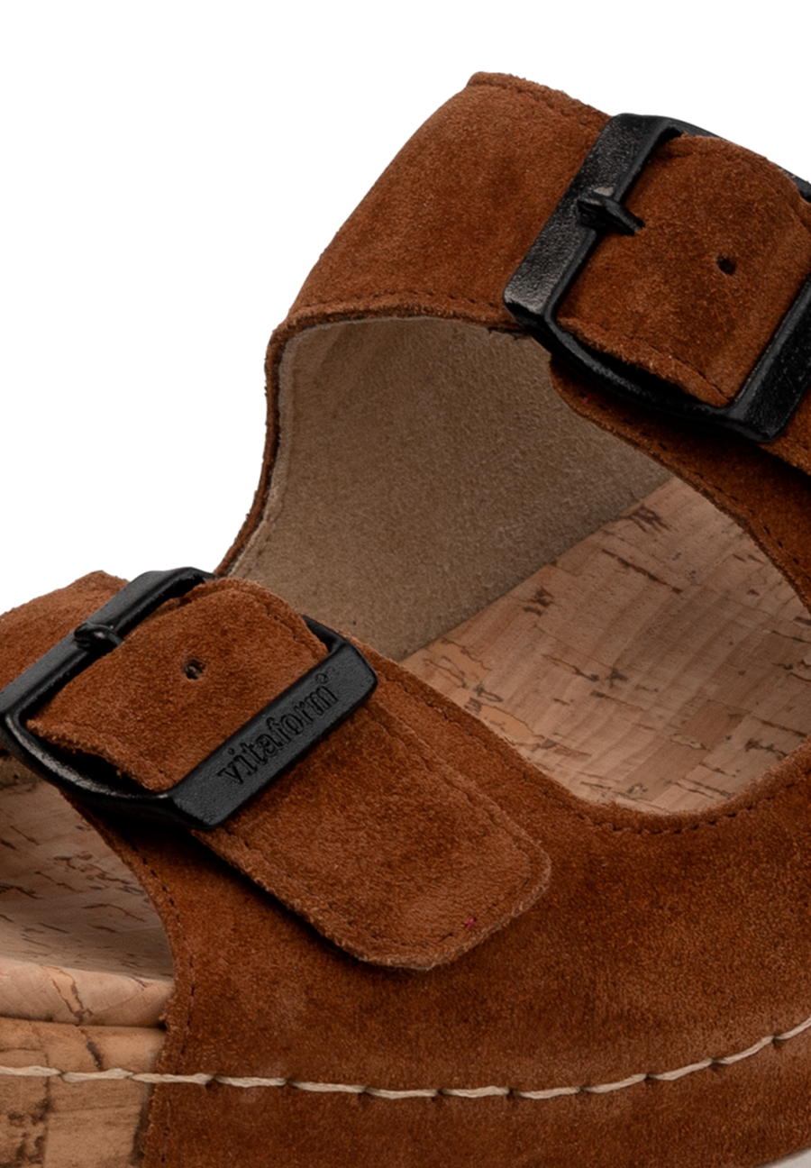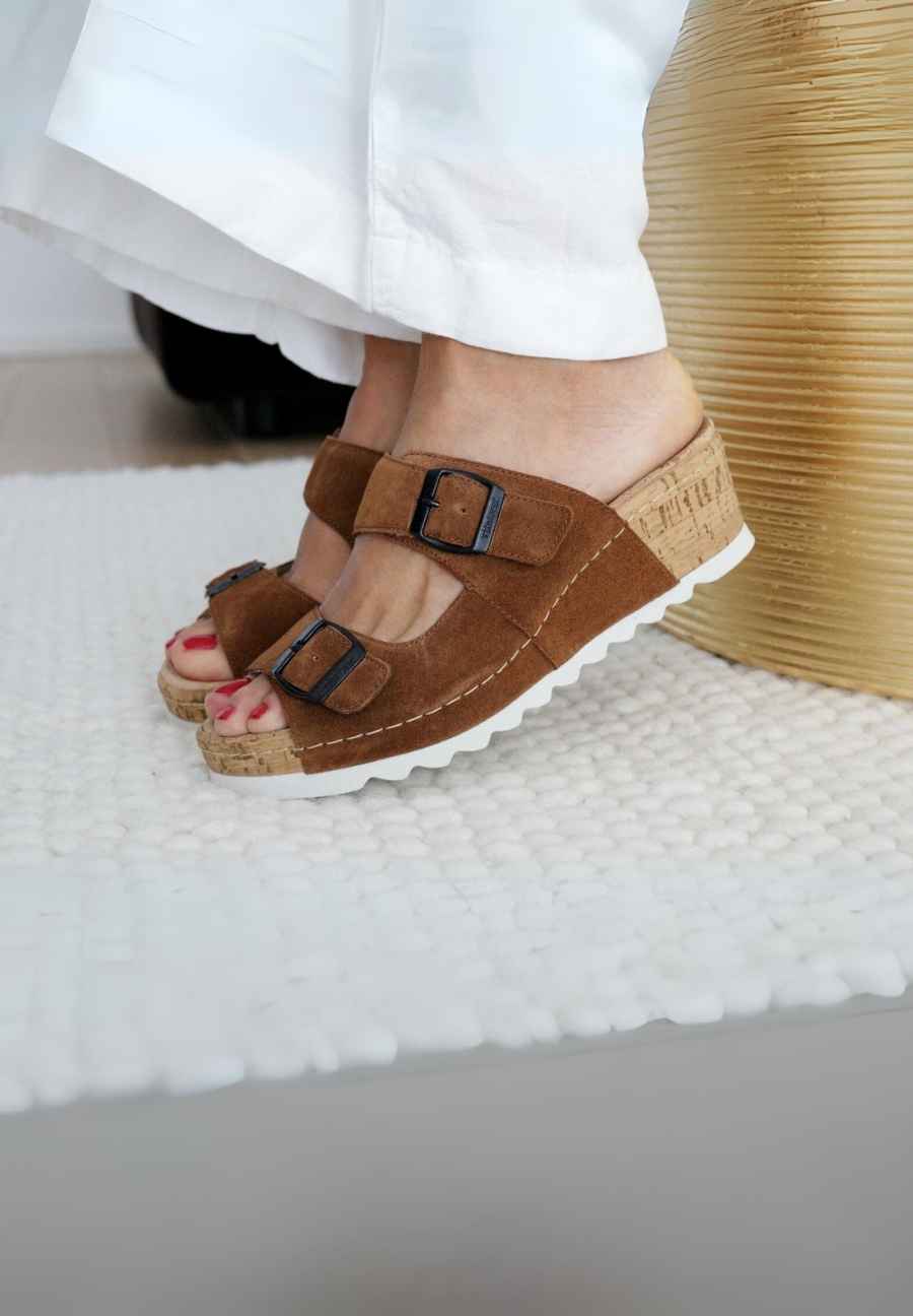 Kork ist der Hit! Und wir nutzen hier die Optik für eine wunderschöne VITAFORM Pantolette! Die Töne Fuchsia und Cognac harmonieren herrlich mit der Korkoptik und das weiche Veloursleder ist angenehm auf nackter Haut. Der kleine Keilabsatz in Kork-Optik (flexibel, robust, pflegeleicht) streckt das Bein und sieht fein feminin aus. Und auch wenn die Riemchen hier Schnalle zeigen – hinter ihnen steckt ein praktischer Klettverschluss. Das alles macht diese Pantolette zu einem Allrounder für viele Gelegenheiten: als sommerlicher Schuh zu Hose oder Kleid oder als schöne gemütliche Schlappe für Haus und Freizeit. Und pssst: das Fußbett ist sogar austauschbar!