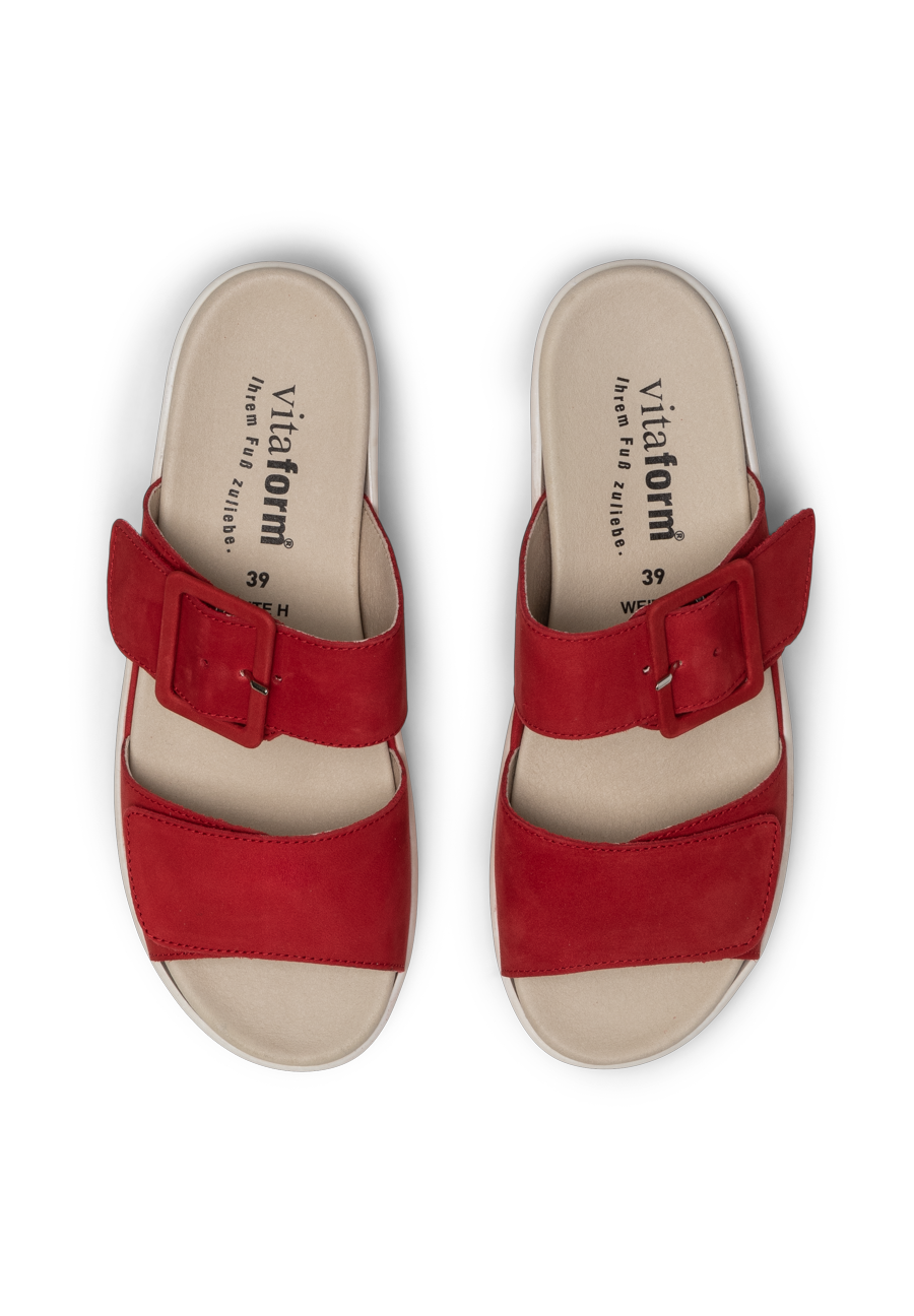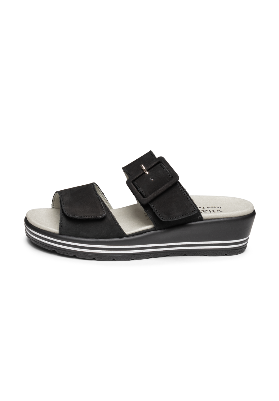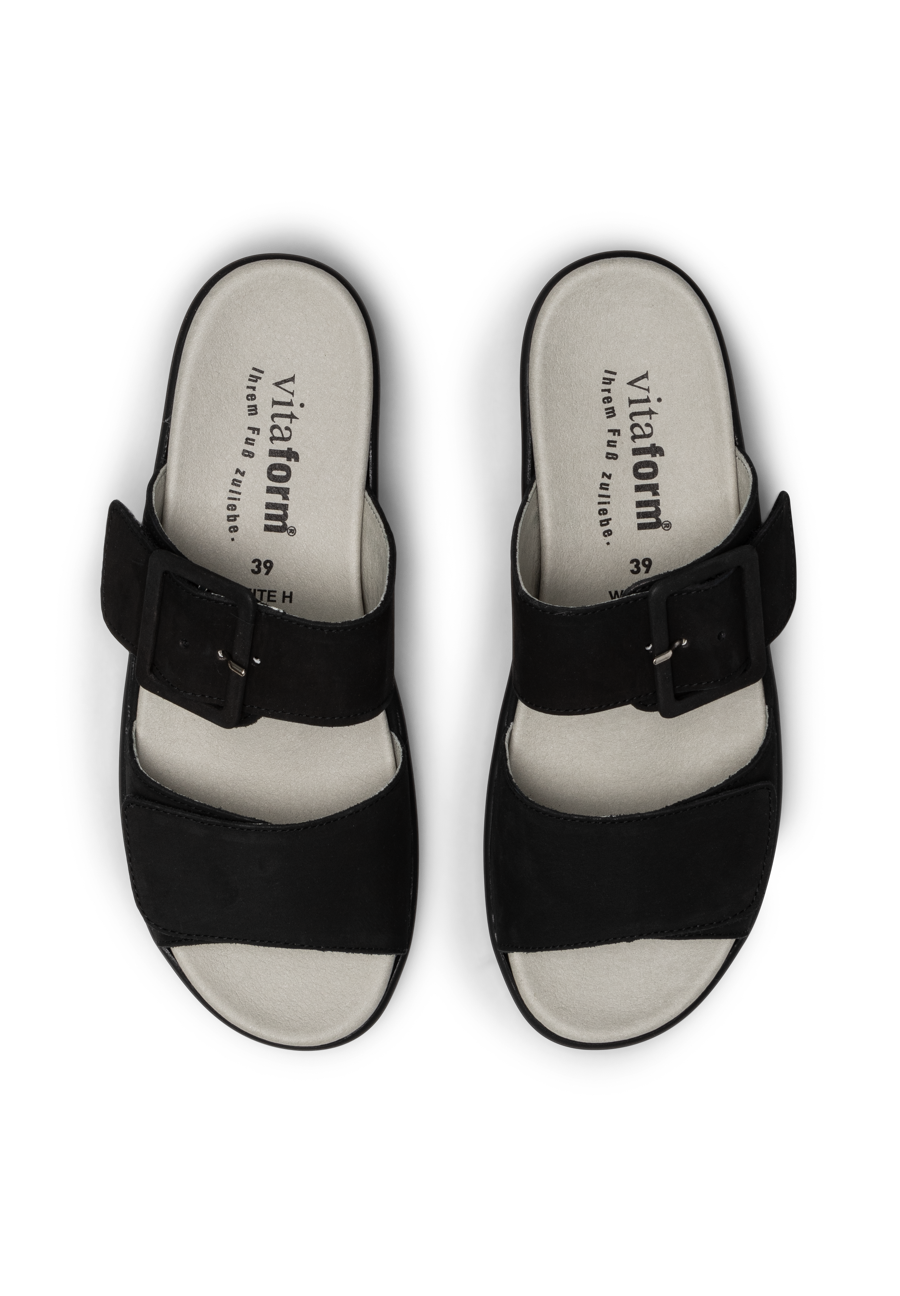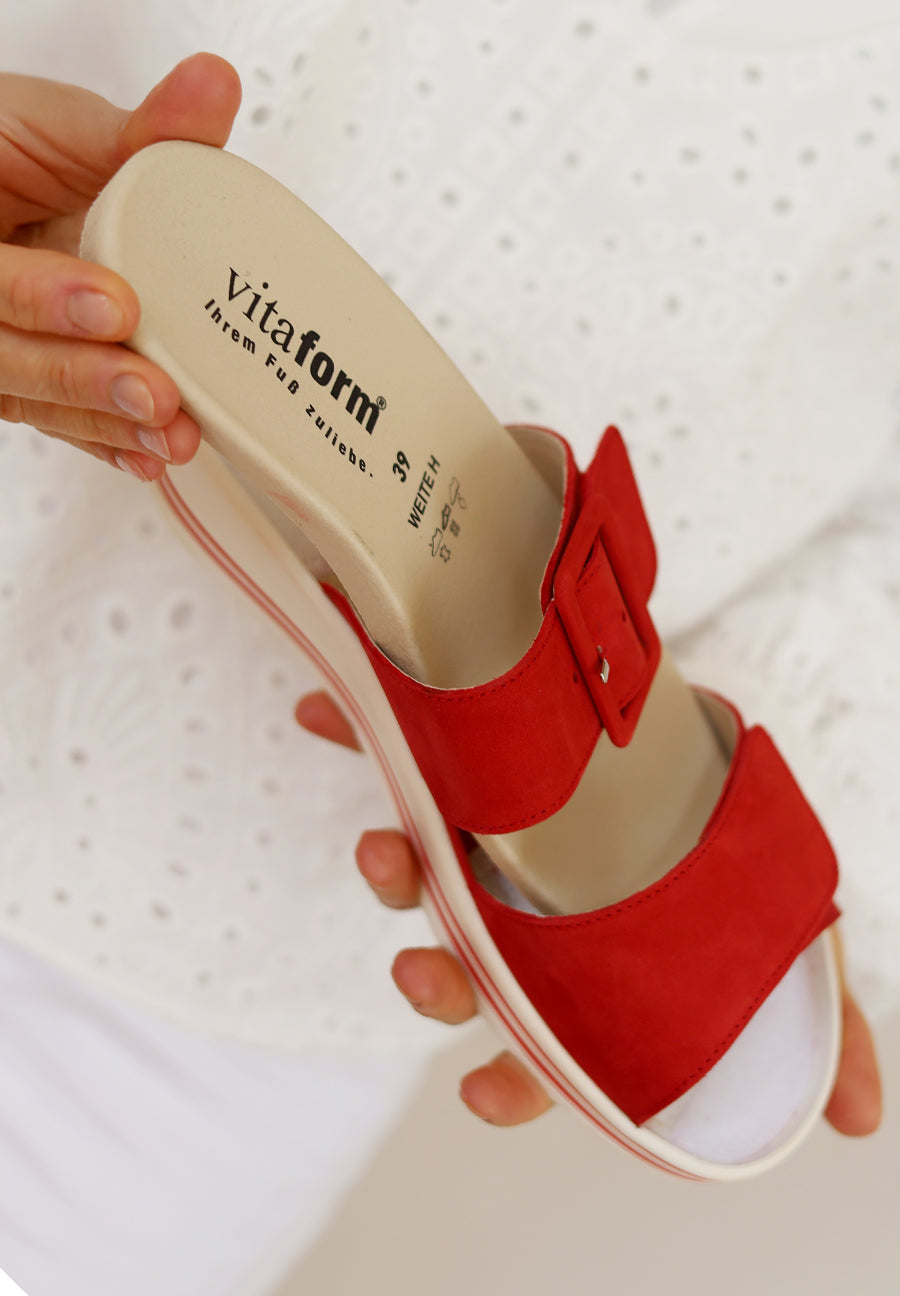 Erleben Sie den ultimativen Komfort und Stil mit unserer VITAFORM Pantolette aus edlem Softnubukleder. Diese exklusive Pantolette vereint luxuriöses Design mit erstklassiger Funktionalität. Die große, elegante Dornschließe und der praktische Klettverschluss ermöglichen eine individuelle Anpassung und sorgen für einen perfekten Sitz. Das integrierte Vakuumluftpolsterfußbett bietet eine unvergleichliche Polsterung und Druckverteilung, wodurch jeder Schritt sanft abgefedert wird und Ihre Fußsohlen optimal unterstützt werden. Genießen Sie ein Laufgefühl wie auf Wolken, während die rutschhemmende Sohle für sicheren Halt auf verschiedenen Oberflächen sorgt. Diese Pantolette ist die ideale Wahl für alle, die Wert auf höchsten Komfort und stilvolles Design legen.