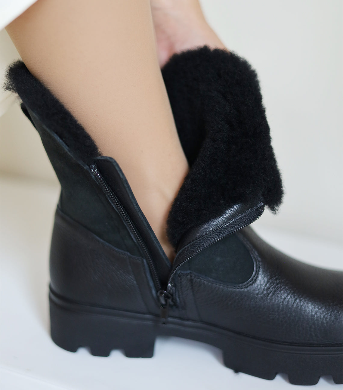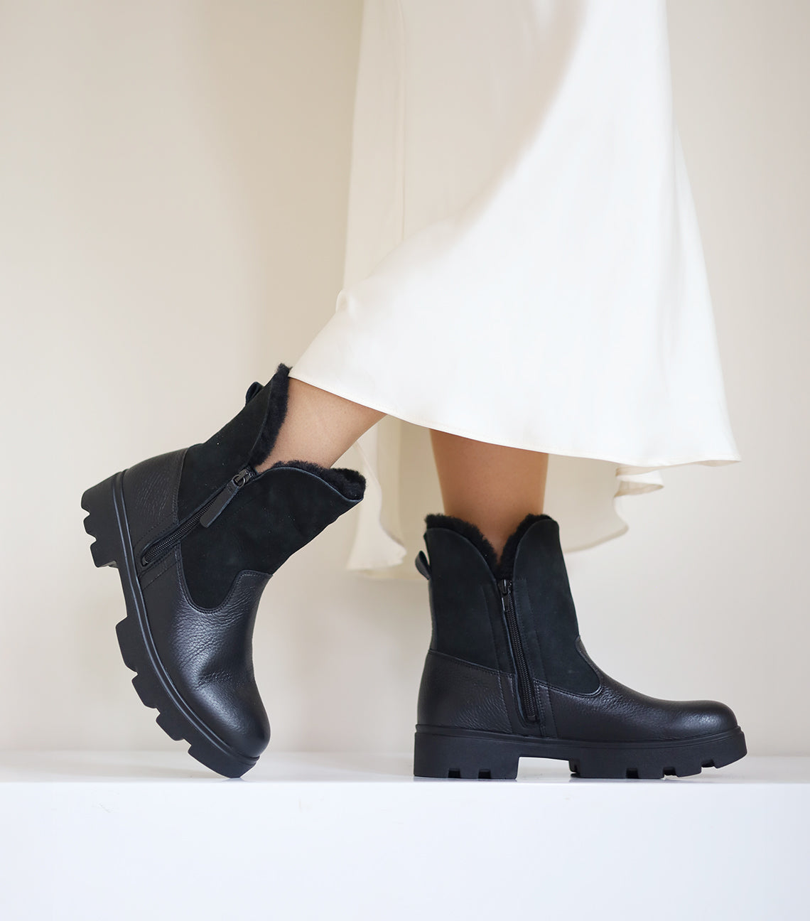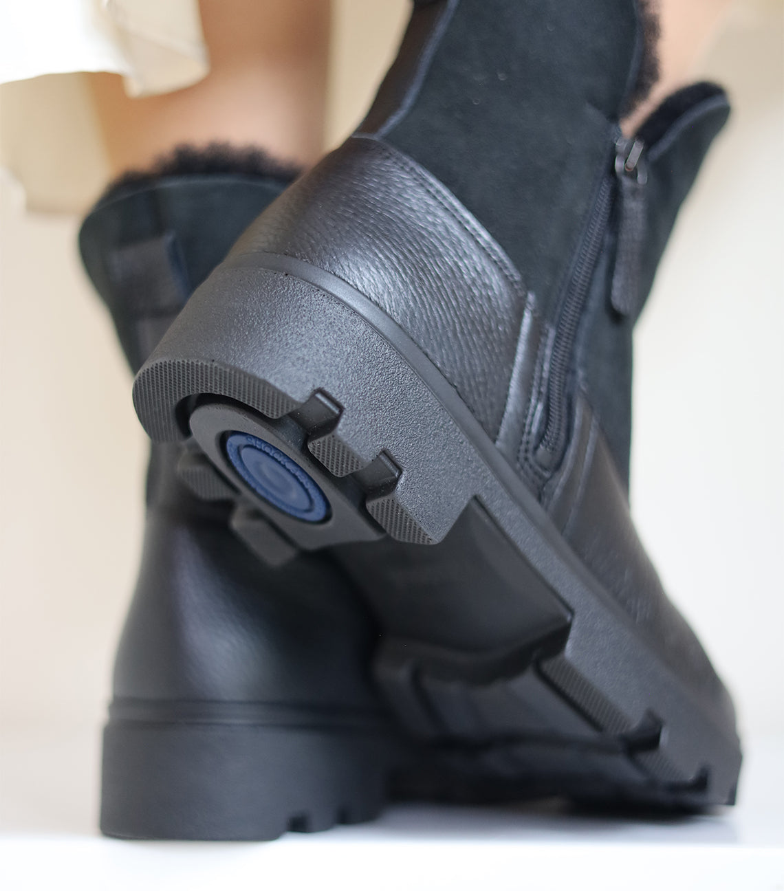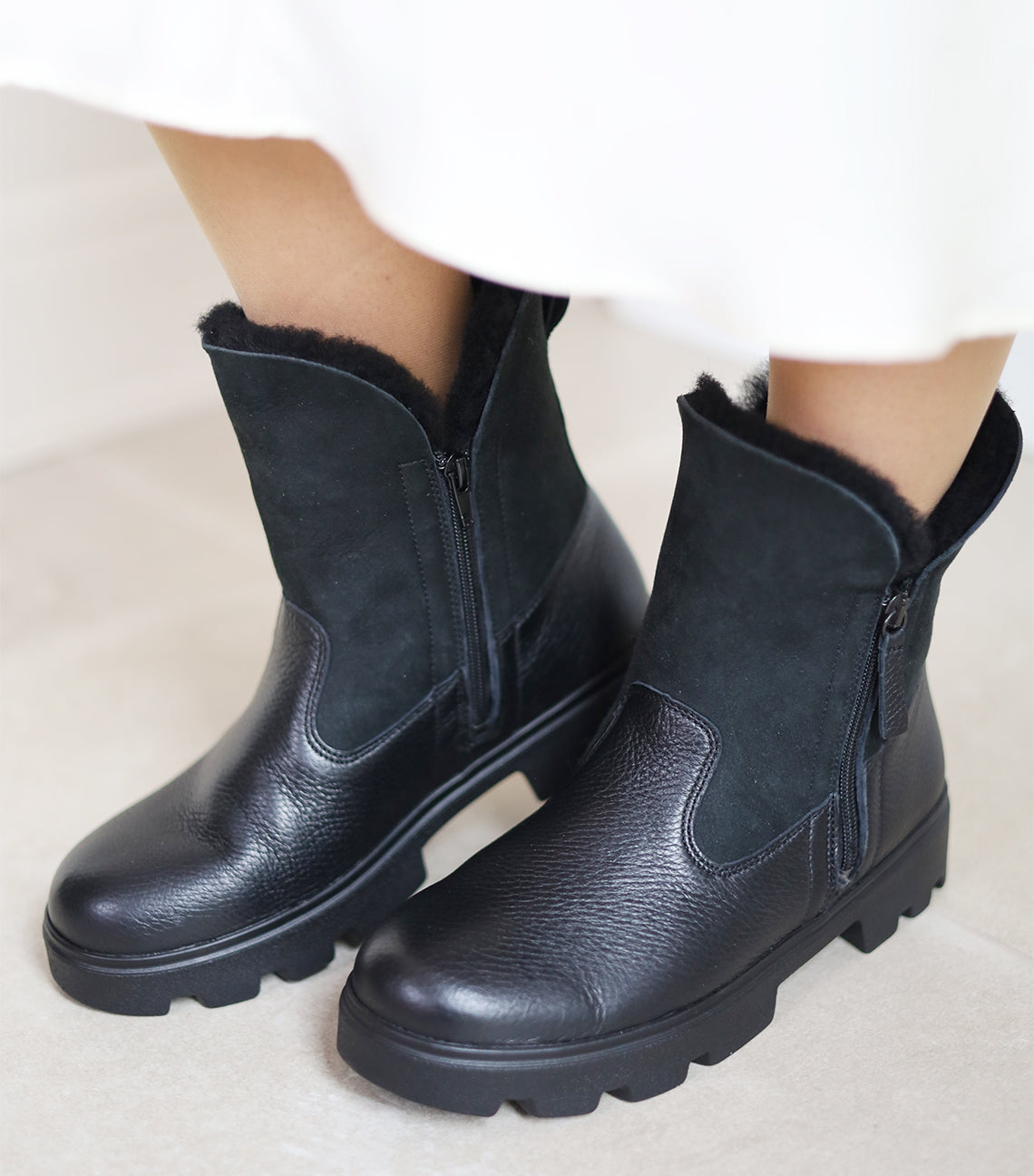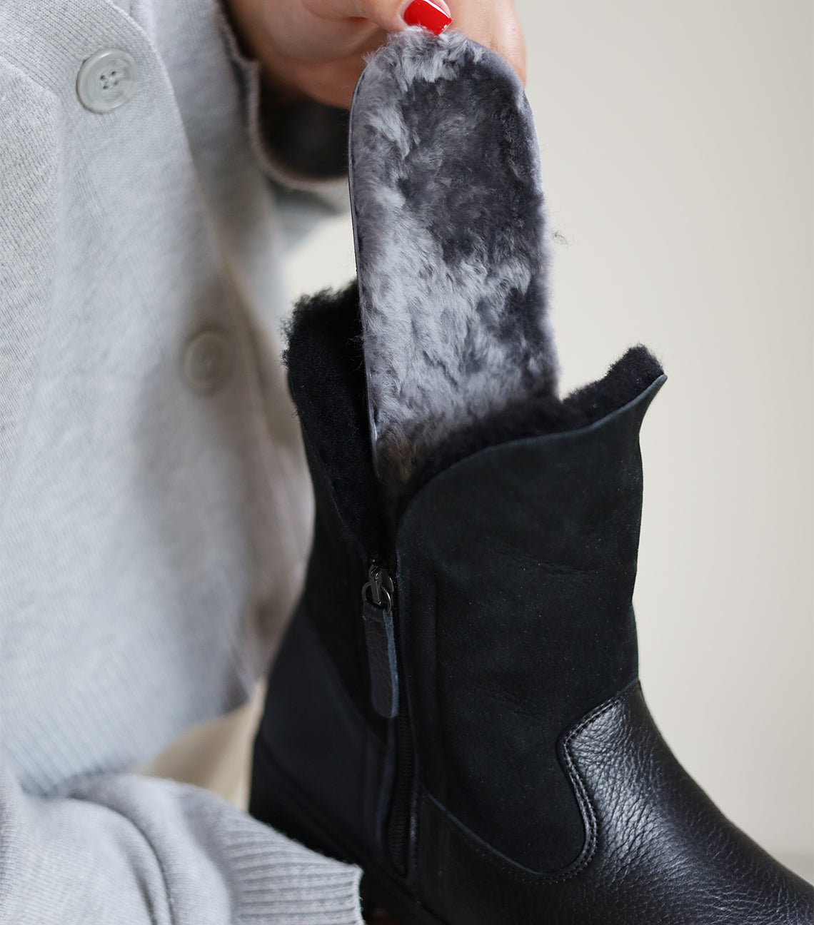 Diese edle VITAFORM Damen Stiefelette aus wunderbar weichem Doubleface Hirschleder verbindet luxuriöse Optik mit höchstem Tragekomfort und unglaublicher Atmungsaktivität. Das kuschelige Lammfellfutter sorgt für wohlige Wärme, während das austauschbare Lammfellfußbett mit integriertem Luftpolster jeden Schritt sanft abfedert und für noch mehr Wärme sorgt. Der eingebaute Shock-Absorber entlastet Gelenke und Rücken spürbar, und dank der komfortablen Weite H finden auch empfindlichere Füße ausreichend Platz. Zwei seitliche Reißverschlüsse ermöglichen einen besonders leichten Einstieg und unterstreichen die Alltagstauglichkeit. Ob beim Flanieren durch herbstliche Straßen oder beim Stadtbummel, diese stylische Stiefelette verbindet Eleganz und Bequemlichkeit auf höchstem Niveau und versüßt Ihnen die kalten Tage mit einem richtig modischen Touch.