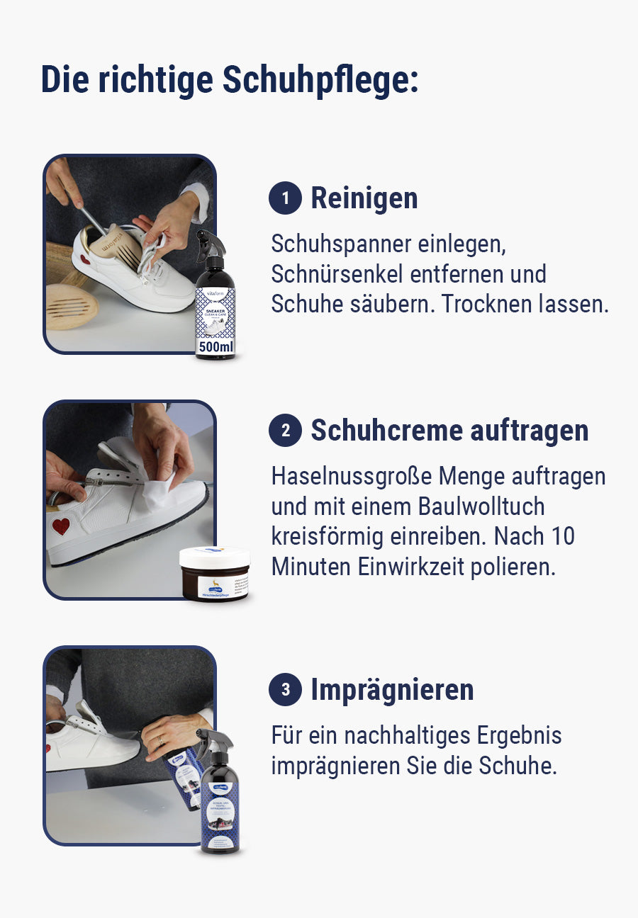 Anwendung: Eine dünne Schicht der VITAFORM Hirschlederpflege auftragen, trocknen lassen, anschließend polieren und den neuen Glanz bestaunen.