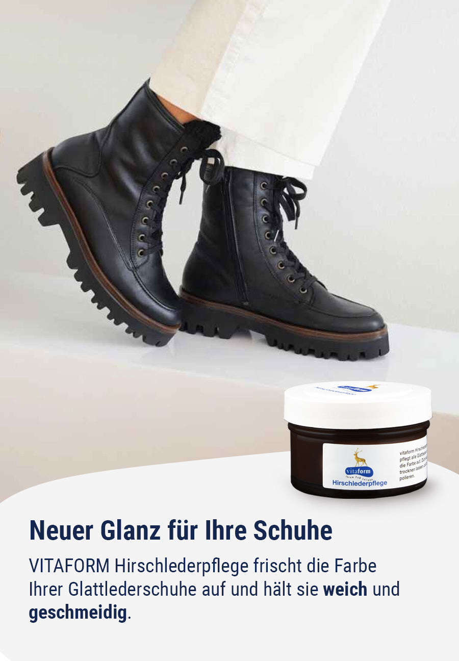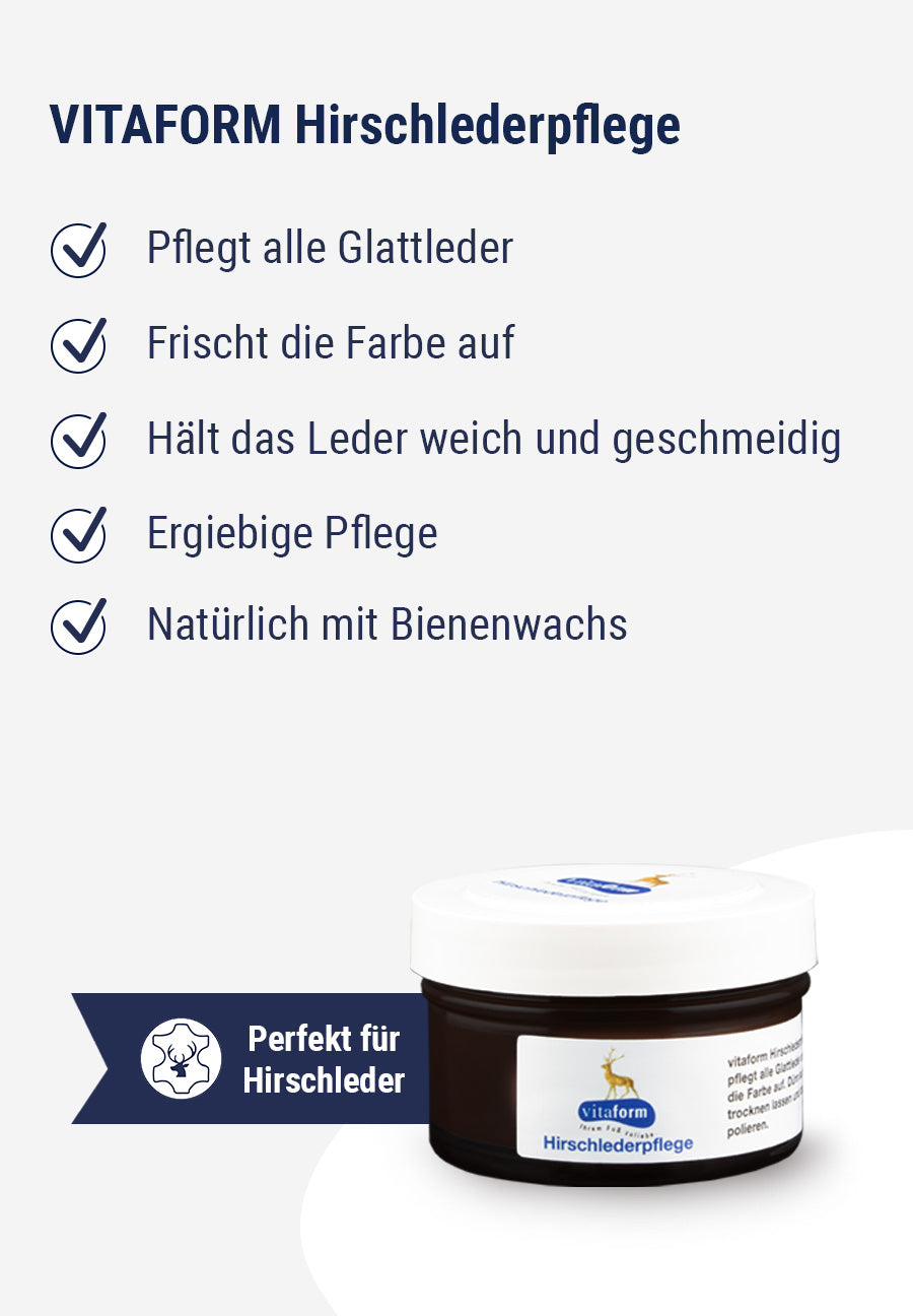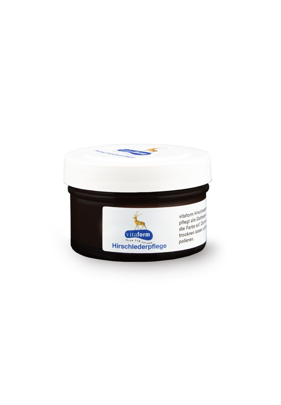 Die Extra-Liebe für pflegebedürftige Schuhe: Lassen Sie das Leder Ihrer Schuhe wieder glänzen und die Farbe strahlen! Mit der VITAFORM Hirschlederpflege hauchen Sie Ihren Schuh-Lieblingen wieder neues Leben ein! Die wachshaltige Pflege speziell für Hirschleder und alle Glattlederarten nährt und pflegt intensiv bis in die Tiefe und sorgt für ein ausdrucksstarkes und sattes Farbergebnis. Die Wundercreme ist lösemittelfrei und besteht aus verschiedenen Wachsen, wie zum Beispiel Bienenwachs, für den extra schönen Glanz der Schuhe.