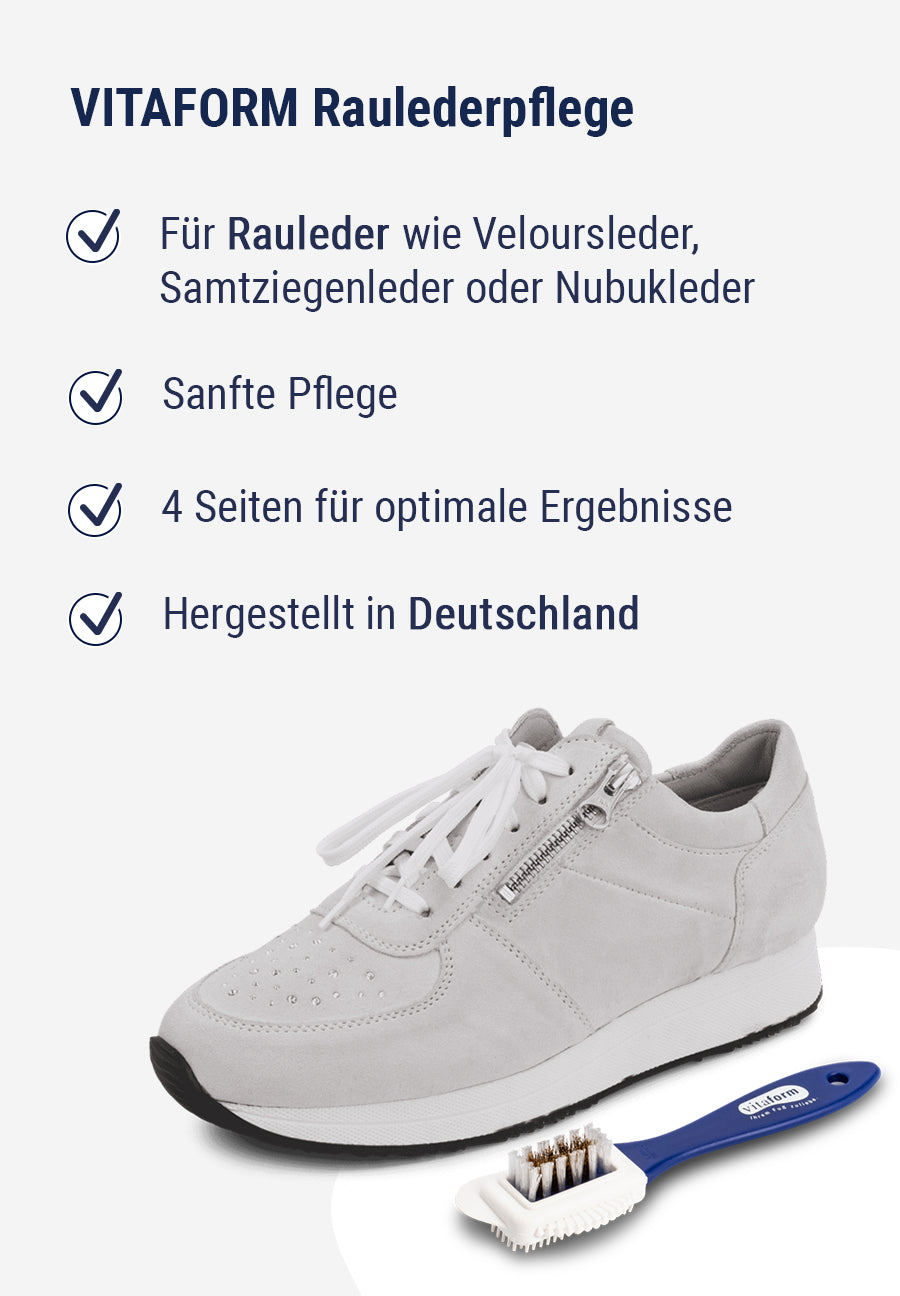 Geben Sie Ihren Schuhen eine reinigende Extra-Streicheleinheit! Um feine Raulederarten wie Nubuk-, Velours- oder Samtziegenleder erneut blitzeblank zu kriegen, sind Raulederbürsten ein unverzichtbares Tool. Tiefsitzender Schmutz kann mit den Messingbürsten vorsichtig herausgebürstet werden. Die flexiblen, weißen Borsten sorgen für ein besseres und kinderleichtes abbürsten von Schmutz.
