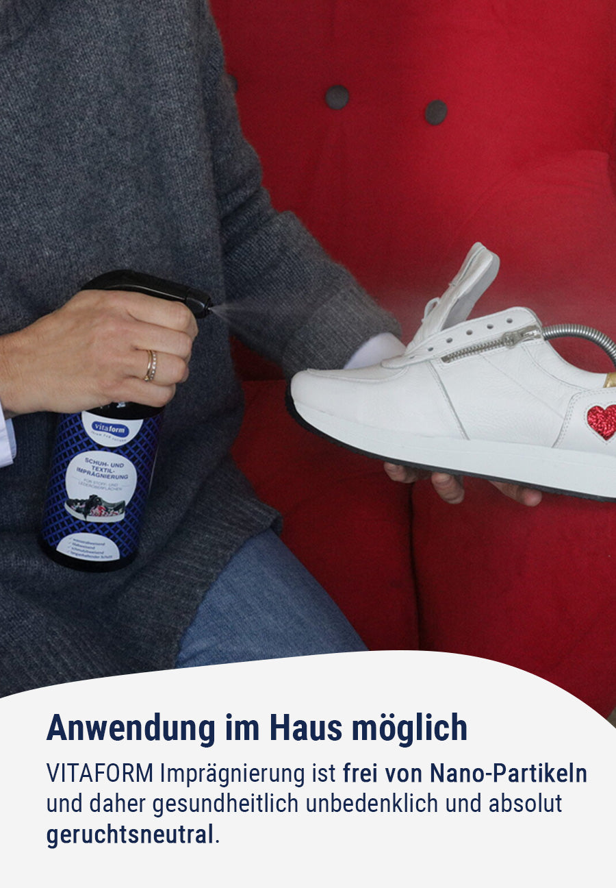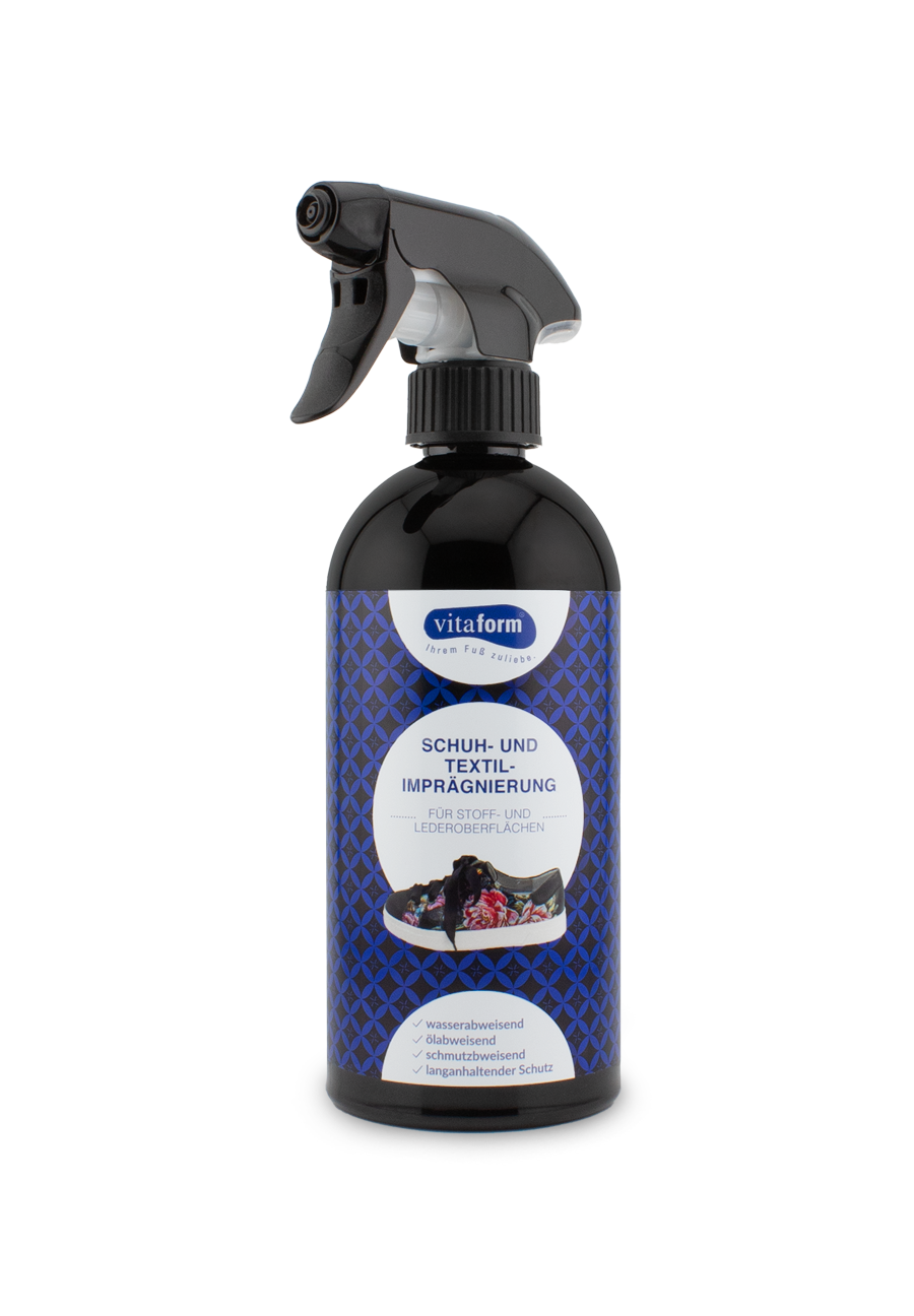 VITAFORM lässt Schuhe nicht im Regen stehen! Wir schauen, dass unsere Schäfchen im Trockenen sind: Mit der brandneuen innovativen VITAFORM Schuh- und Textilimprägnierung für textile Oberflächen und Leder, sind sie maximal vor Wasser geschützt. Es ist eine neuartige Versiegelung OHNE Nanopartikel aber mit der gleichen Wirksamkeit. Es schont Ihre Gesundheit und die Umwelt! Die ultimative Schutzbarriere in zwei einfachen Steps: 1. (Nur einmal) Aufsprühen auf den Schuh-Liebling 2. Anschließend trocknen lassen. Inhalt: 500 ml