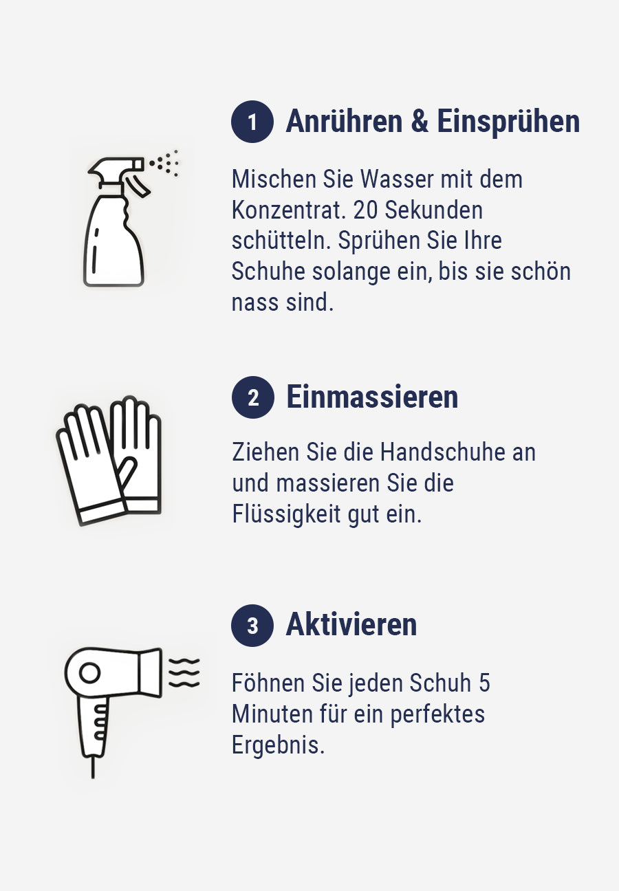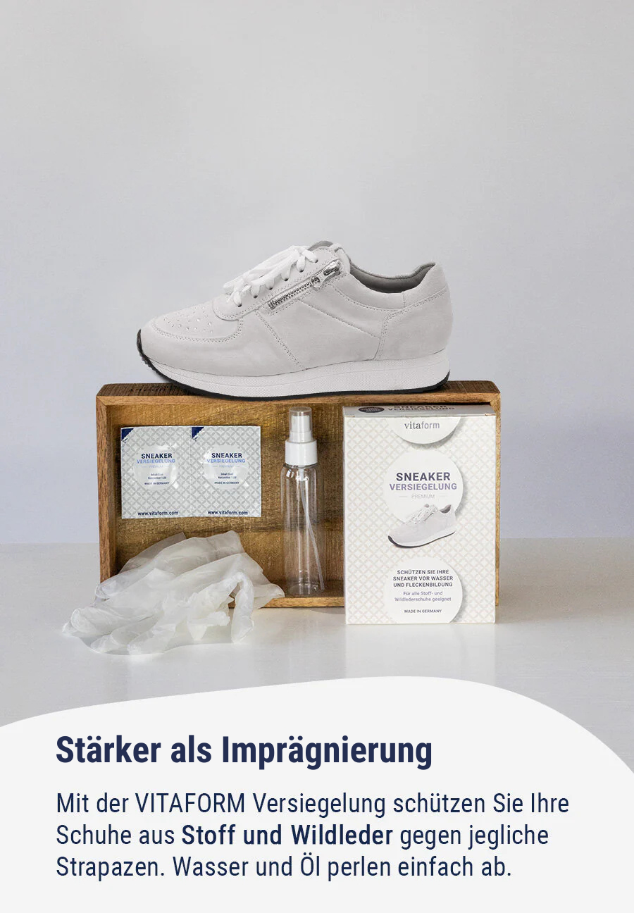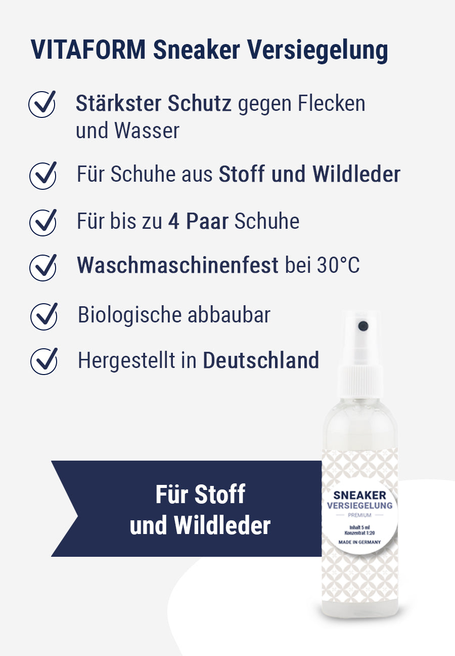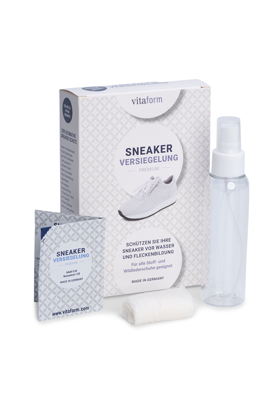 Wie wäre es, wenn Sie unansehnliche Flecken und Schmutzränder auf Ihren neuen Sneakern einfach verhindern könnten? Können Sie! Mit der VITAFORM Sneaker-Versiegelung. Es ist der ultimative Sneaker-Schutz für Stoff und Wildleder. Einfach einsprühen, einmassieren und trockenföhnen – fertig! Schon wird Ihr neuer Lieblingsschuh optimal vor Flecken geschützt. Da es wasserbasiert ist, ist eine Farbveränderung dabei ausgeschlossen. Diese Versiegelung ist biologisch abbaubar. Unser Tipp: Unbedingt ausprobieren!