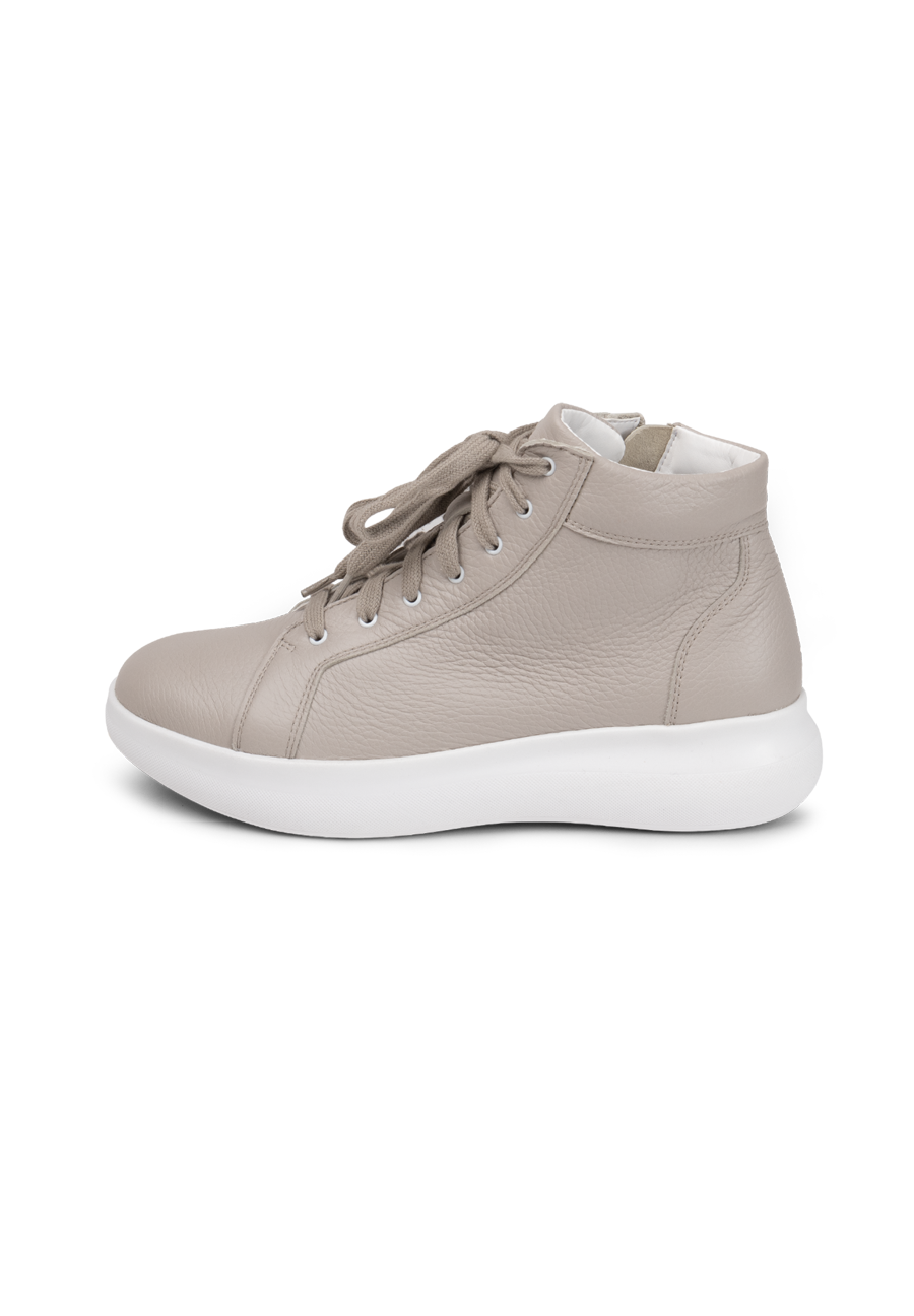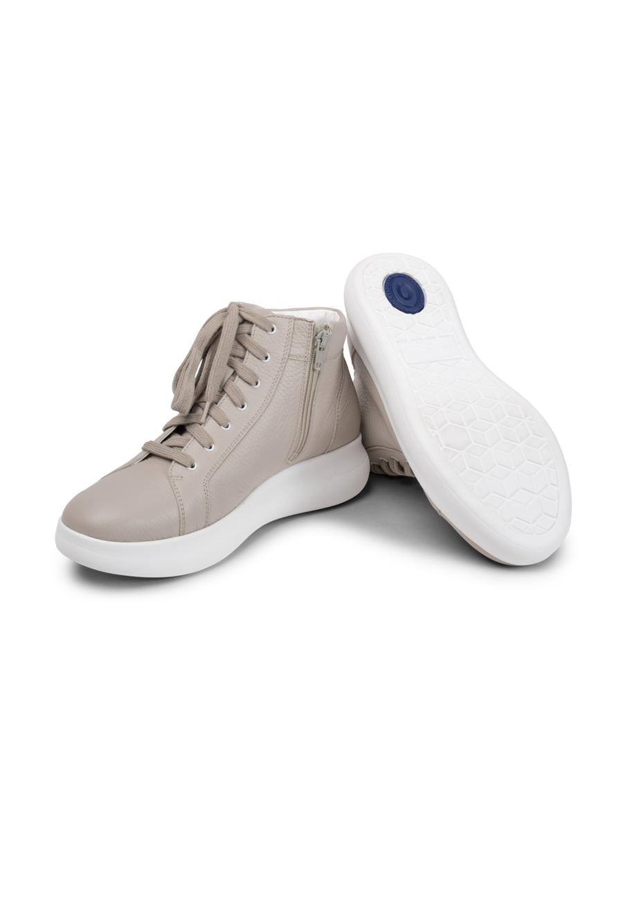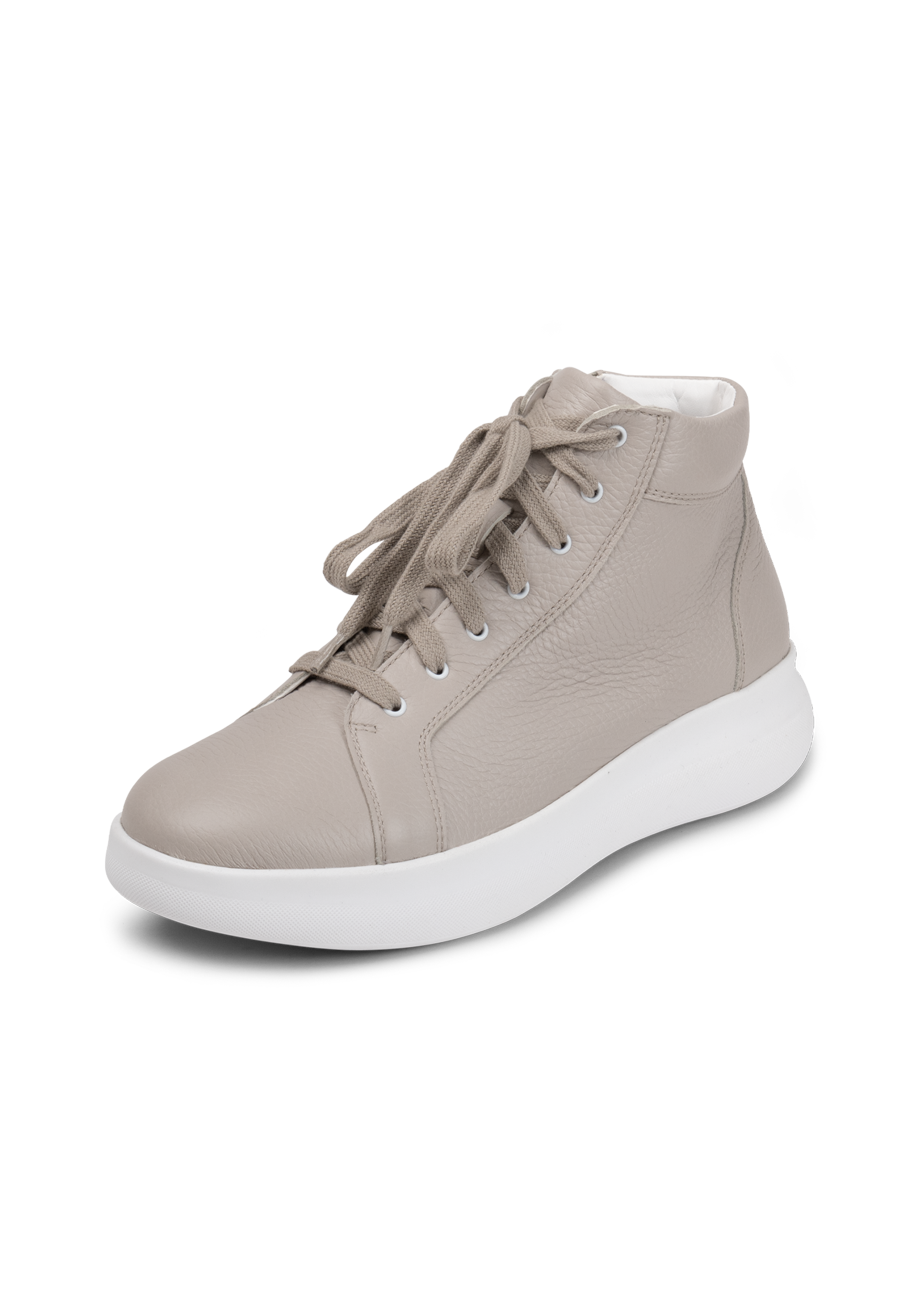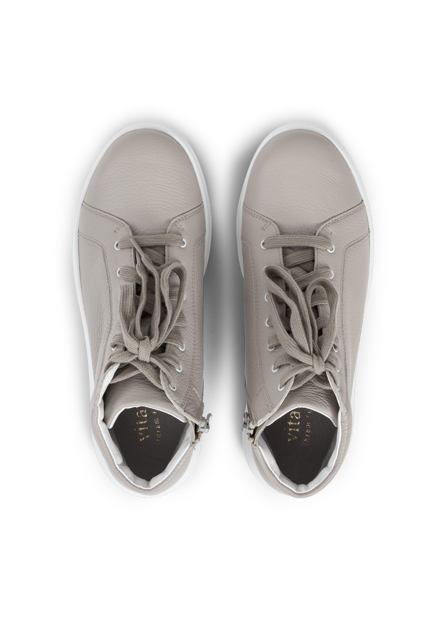 Da schlägt das Herz von Turnschuh-Fans wortwörtlich höher: diese VITAFORM Sneakers sind nicht nur retro angehaucht, angesagt minimalistisch, sondern auch noch knöchelhoch. In Weiß, Puder und Betongrau machen sie Streetstyle extra cool und wirklich zu allem kombinierbar. Ob zu Slim Jeans, dreiviertel-langer Culotte, mondäner Marlene-Hose oder zu kurzen Hosen, Röcken oder wallenden Blumenkleidern – der Hightop ist ein echter Allrounder. Sein edles, superweiches Hirschleder, das extra Luftpolsterfußbett mit Lederbezug und der Shock-Absorber sorgen für Komfort. Und der seitliche Reißverschluss macht das An- und Ausziehen der VITAFORM Hightop Sneaker ganz ohne Schnüren möglich. Modische Superklasse, die auch im Komfort eine Eins mit Sternchen bekommt.