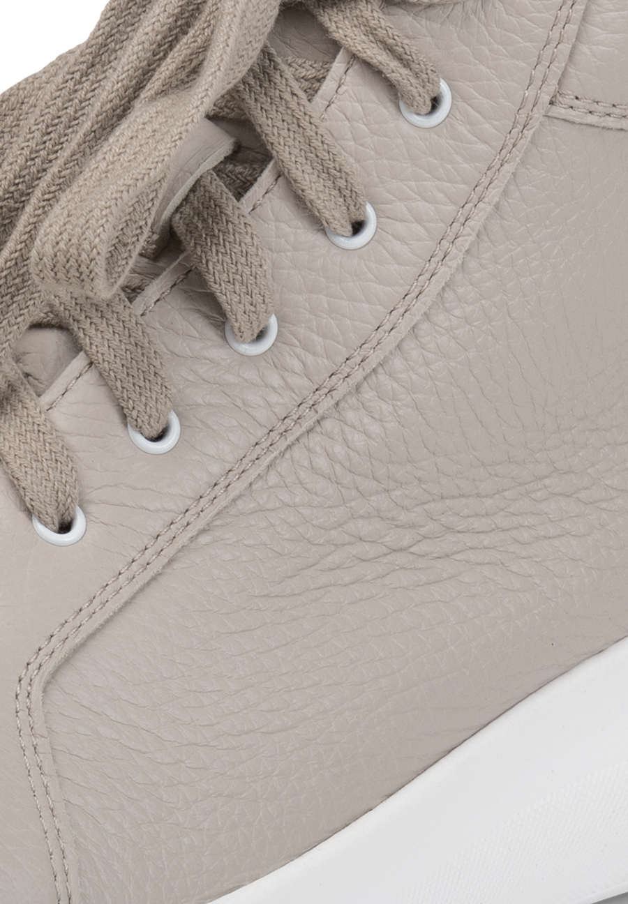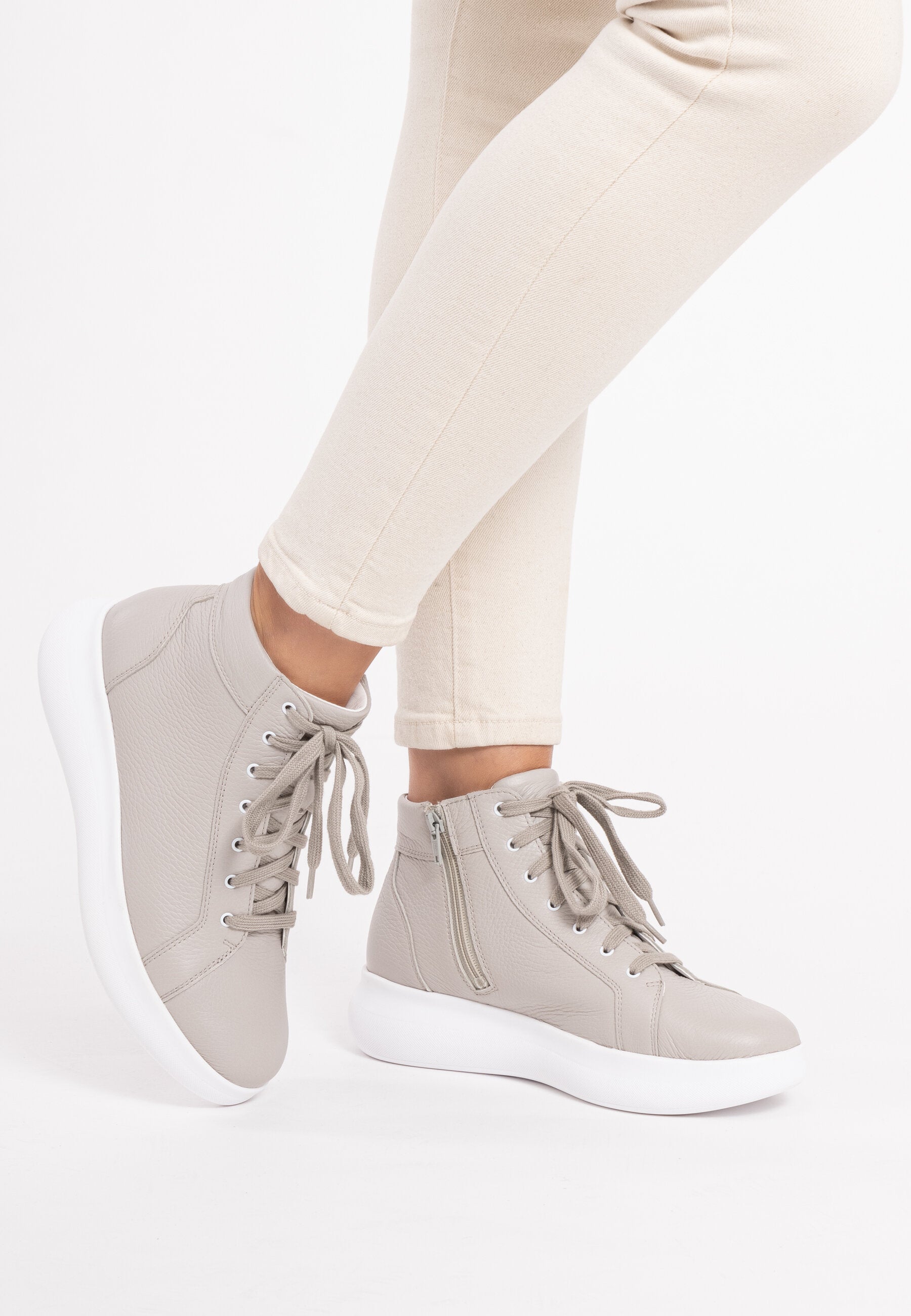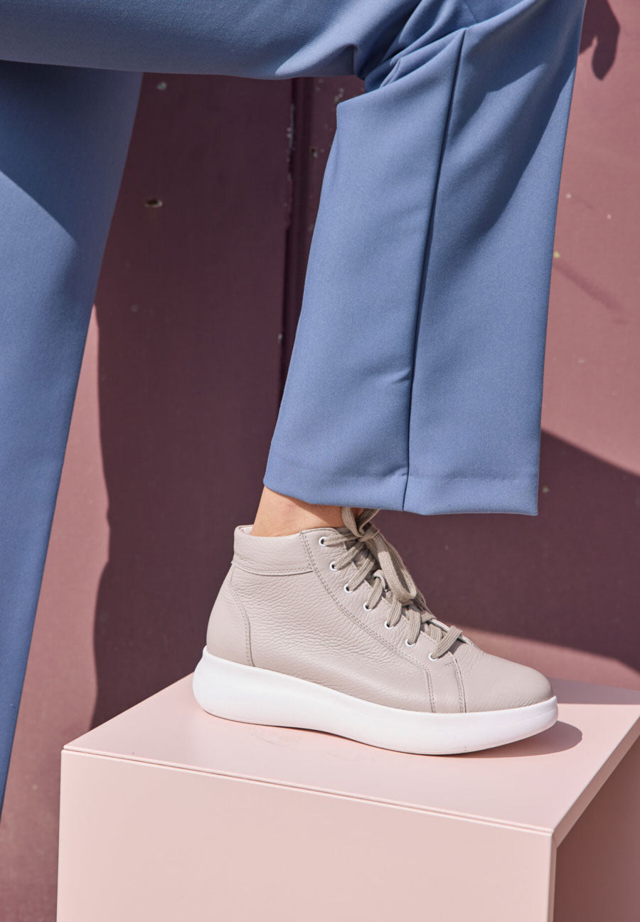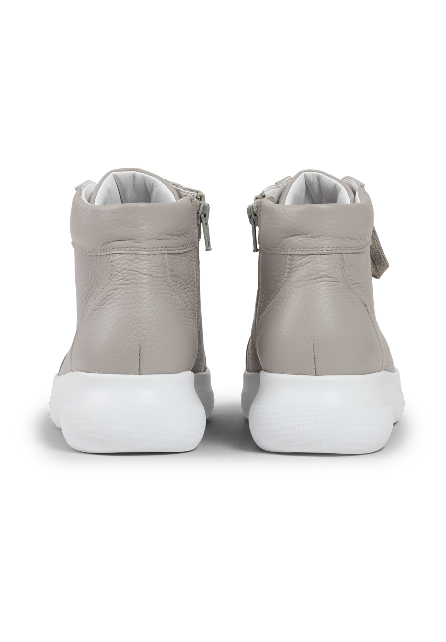 Da schlägt das Herz von Turnschuh-Fans wortwörtlich höher: diese VITAFORM Sneakers sind nicht nur retro angehaucht, angesagt minimalistisch, sondern auch noch knöchelhoch. In Weiß, Puder und Betongrau machen sie Streetstyle extra cool und wirklich zu allem kombinierbar. Ob zu Slim Jeans, dreiviertel-langer Culotte, mondäner Marlene-Hose oder zu kurzen Hosen, Röcken oder wallenden Blumenkleidern – der Hightop ist ein echter Allrounder. Sein edles, superweiches Hirschleder, das extra Luftpolsterfußbett mit Lederbezug und der Shock-Absorber sorgen für Komfort. Und der seitliche Reißverschluss macht das An- und Ausziehen der VITAFORM Hightop Sneaker ganz ohne Schnüren möglich. Modische Superklasse, die auch im Komfort eine Eins mit Sternchen bekommt.